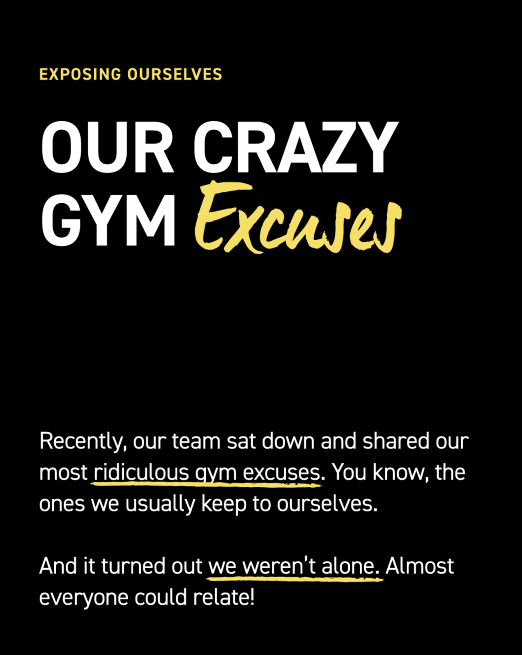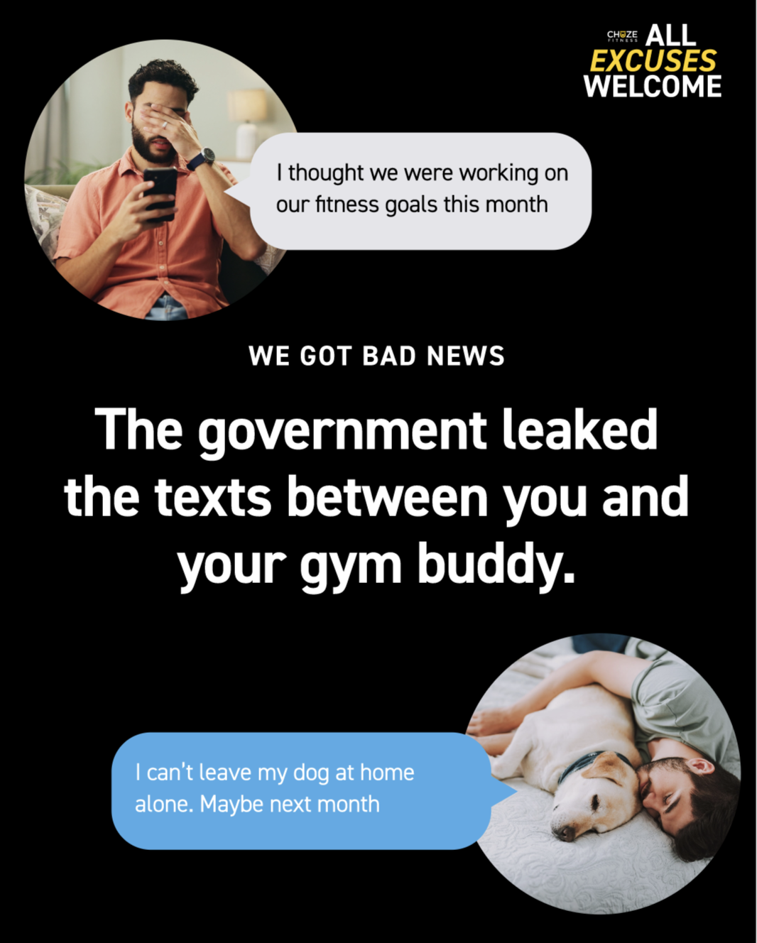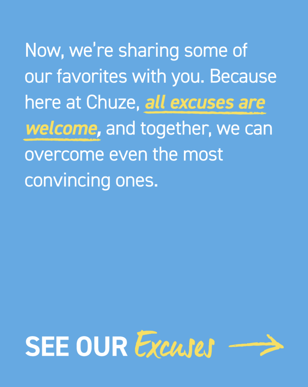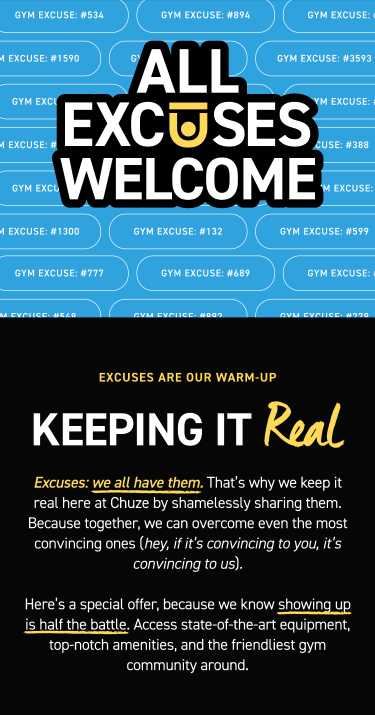 By calling out these excuses with a wink and a laugh, we turned them into something we could overcome together. Because at Chuze, it doesn’t matter why you didn’t want to come in today—what matters is that you showed up anyway.